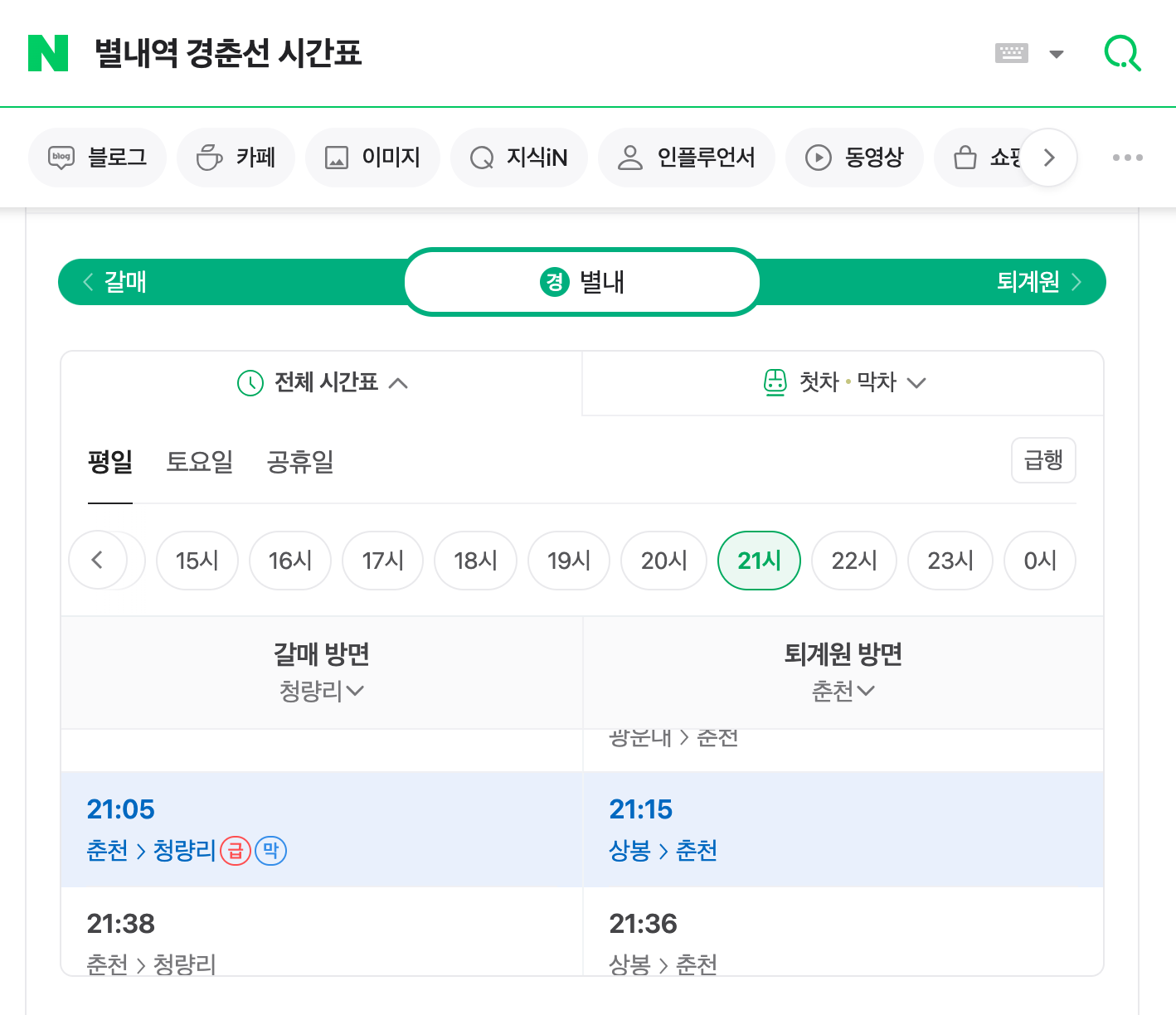 1) 네이버에 "별내역 경춘선 시간표" 검색하기