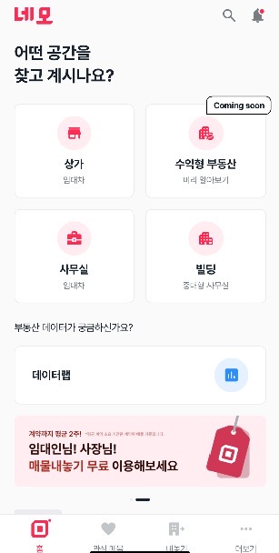 상가 매물 등록을 누르면 네모 어플로 이동합니다. 네모 어플이 직방에서 파생되어 상가를 다루는 어플로 보입니다.