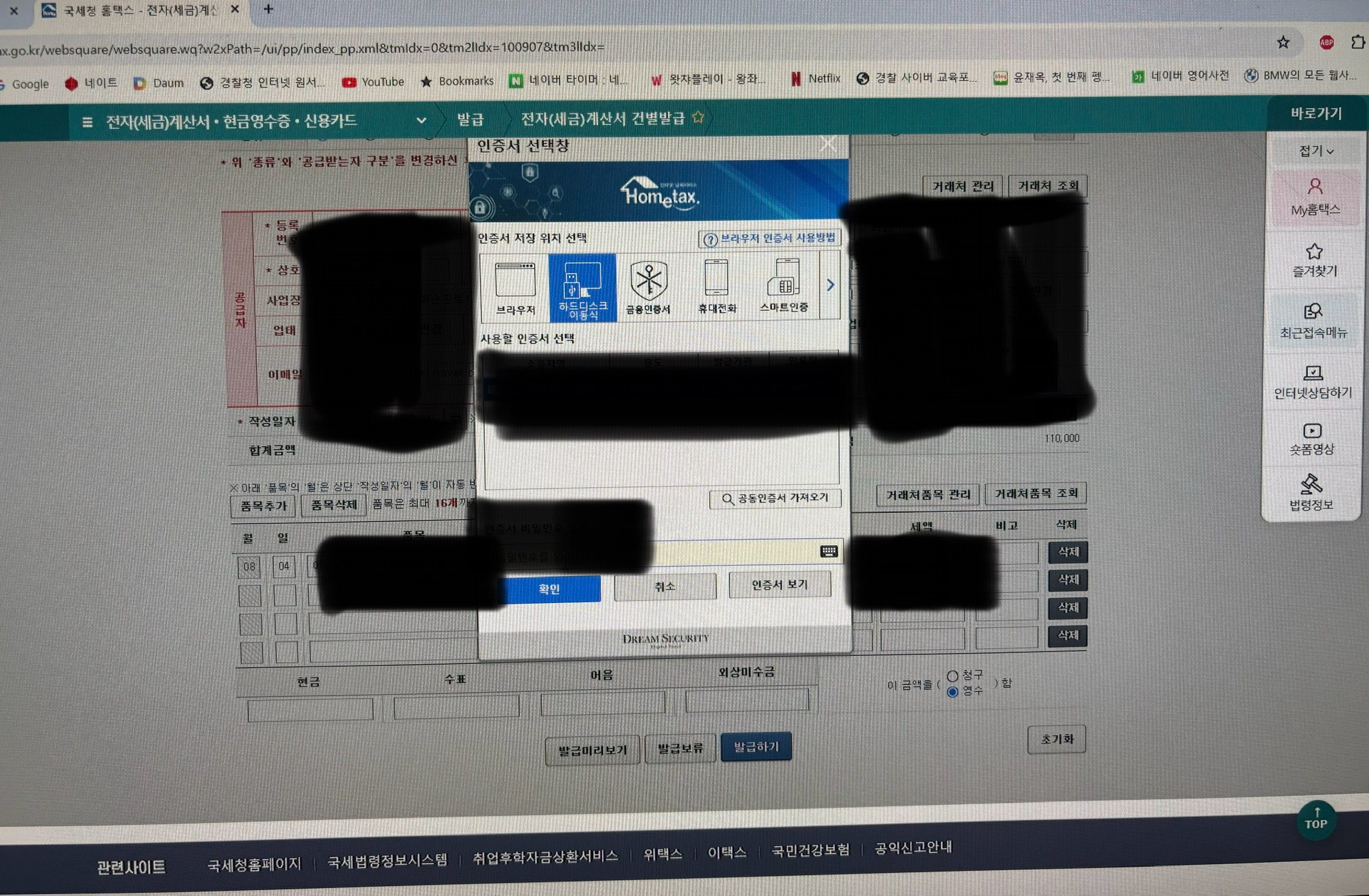 전자 세금 계산서의 내용을 모두 작성한 이후 ‘발급하기’ 버튼을 누르면 위와 같은 화면이 뜹니다.