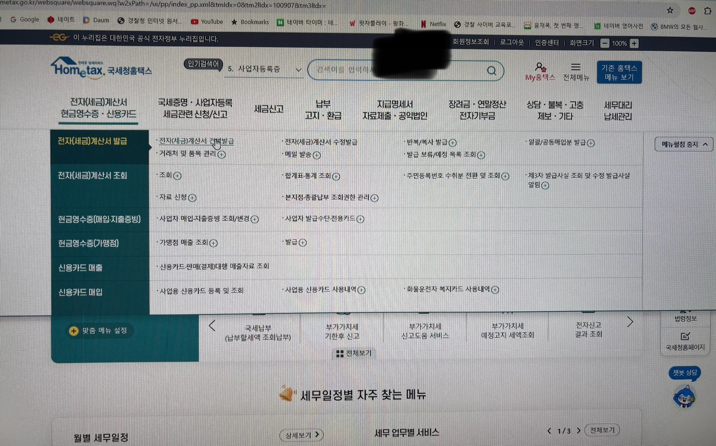 1) 왼쪽 상단 ‘전자세금계산서 현금영수증 신용카드’ 클릭